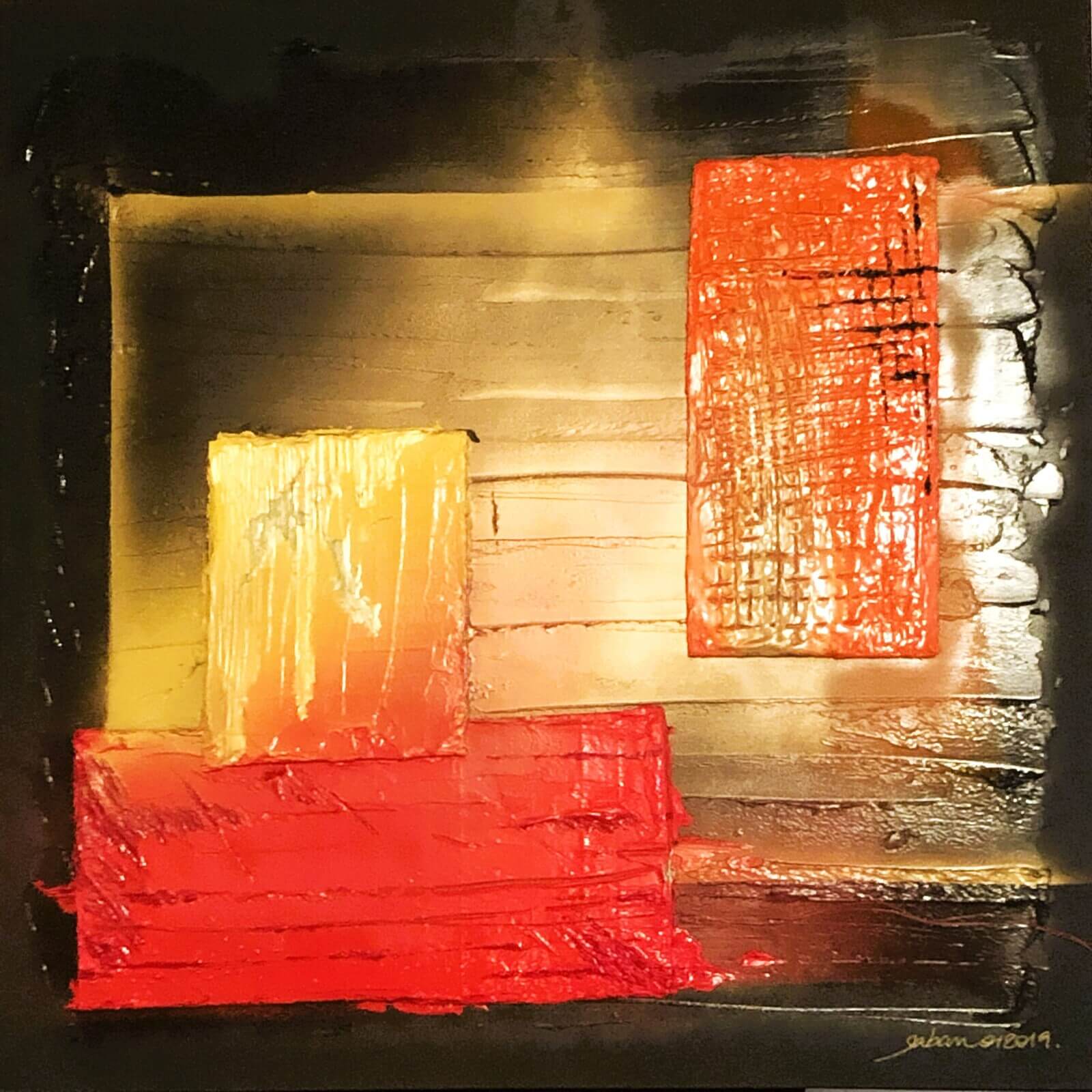 « Issue » marque une transition : celle d’un enfermement vers une échappée possible, d’un état contraint vers une respiration. Sur cette toile carrée et dense, un maillage orangé — grillage ou treillis incertain — s’impose comme une structure de tension. Mais déjà, des brèches s’ouvrent. Le fond sombre, travaillé en strates, semble vibrer sous la surface, comme une mémoire vivante en train de se libérer.