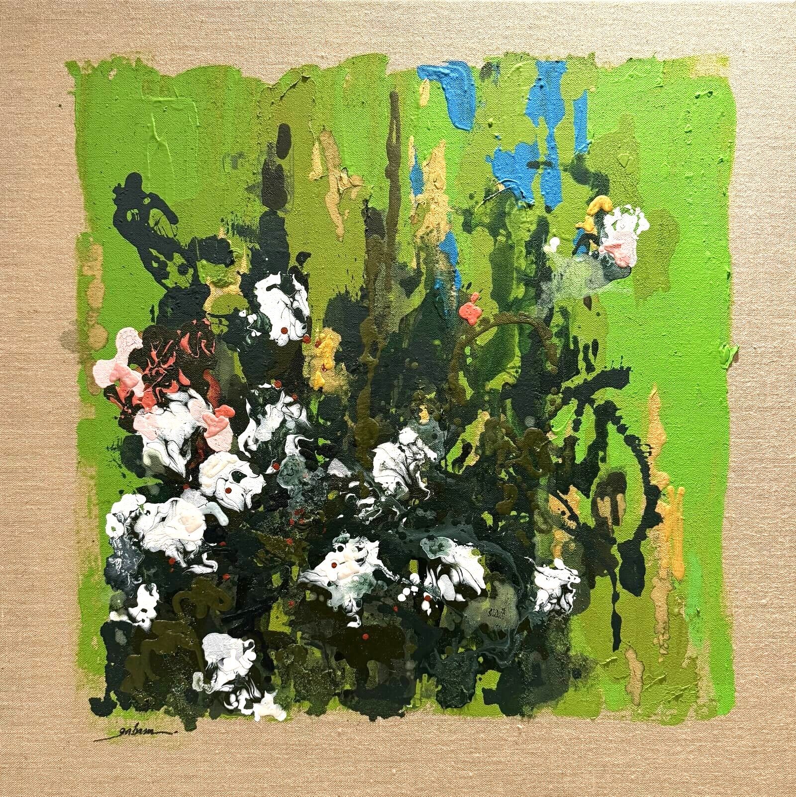 La palette verte se fait ici dense, presque vibrante, traversée de tensions internes. Les blancs et roses percent la masse, ils signalent un point de bascule, un seuil de transformation.